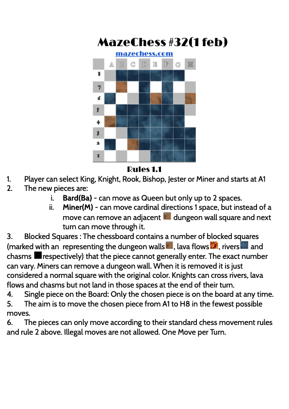 For yesterdays mazechess challenge only King can complete in 10 moves so well done to all those who picked the King.Here’s the challenge for today and remember today is the first day using V1.1 of the rules.