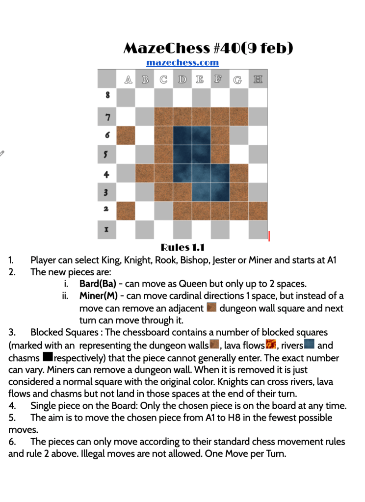 For yesterdays mazechess challenge Rook Jester King and Miner can complete and Rook is fastest in 7 moves so well done to all those who picked the Rook. Here’s the challenge for today. Add your comments below for who is the fastest piece?