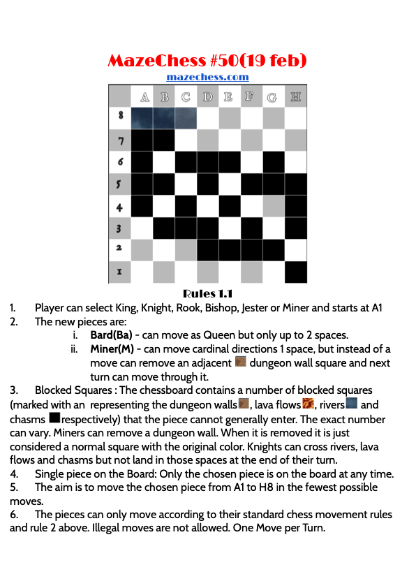 Woo Hoo!!!! we have hit 50!!!!! For yesterdays mazechess challenge Bishop can complete the challenge in 6 moves. Here’s todays, challenge and add your comments below for who is the fastest piece?