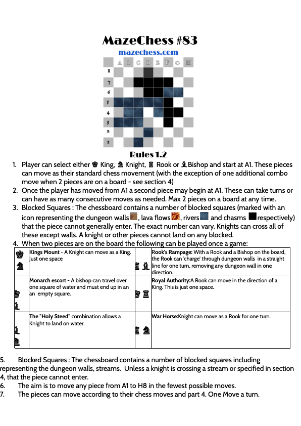 For Mazechess 82 of the mazechess challenge the King and Rook can complete the challenge in 7 moves using Royal Rampage combo. Here’s Mazechess 83 and add your comments below for who is the fastest piece?
