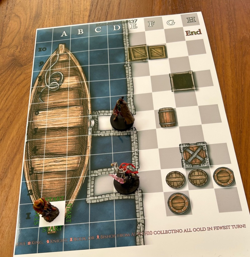 The following is an example of an A4 sheet that I have printed to using one of my latest mazechess challenges. This is a pretty good example of how these could be use in actual TTRPG games using miniatures.
